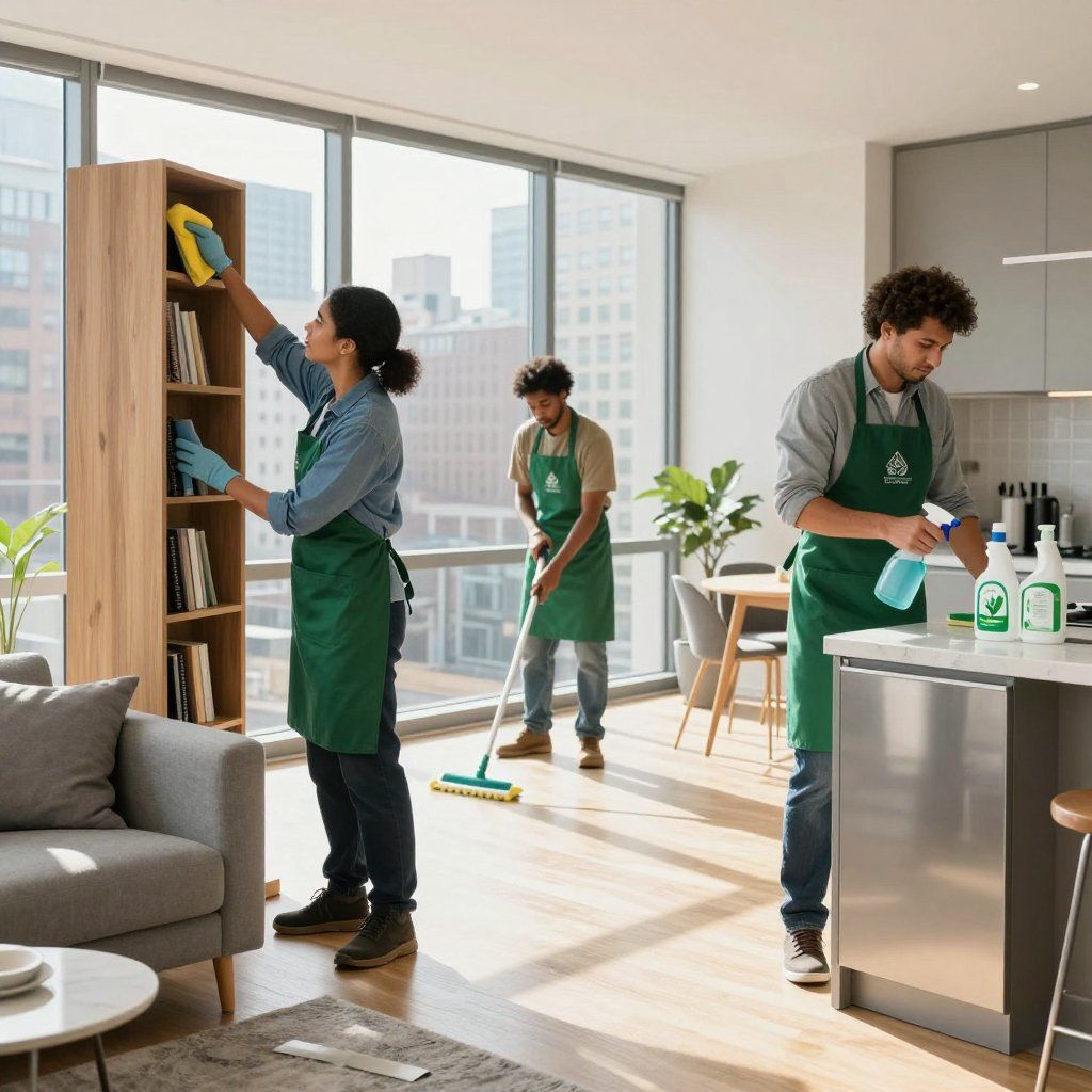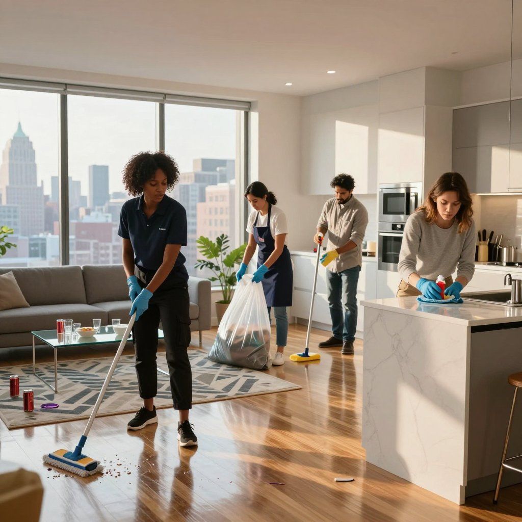 After the party, we come in and handle everything — floors, surfaces, trash, bathroom, kitchen, whatever needs doing. We work around your schedule and your building. Some buildings have rules about trash removal or elevator usage — we're used to that. Just let us know the situation and we'll figure it out.